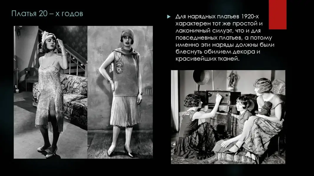 Это та эпоха, в которую начала творить Шанель (ее модный дом открылся в Довилле в 1913 году, но популярность приобрел только к середине 20-х годов). Первым делом она подарила женщинам брюки. Но никуда не исчезли и платья. Хотя и стали абсолютно другими (Презентация 1. ppt. 5 слайд).