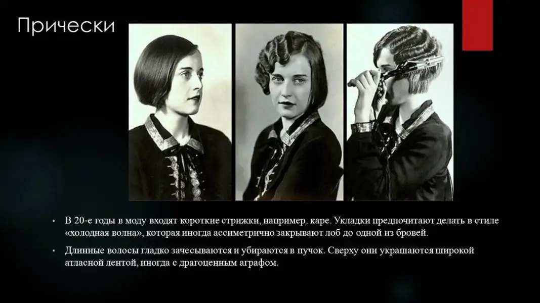 В качестве бижутерии необыкновенно популярны длинные нити жемчуга, браслеты, похожие на древние, крупные серьги-клипсы. А еще в 20-х начали носить часы на руке (Презентация 1. ppt. 15 слайд).