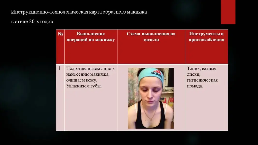 Диагностика модели (Презентация 2. ppt. 15 слайд). Инструкционно-технологическая карта образного макияжа в стиле 50-х годов. Стиляги (Презентация 2. ppt. 16, 17, 18, 19 слайды). Модель в образе 20 - х годов (Презентация 2. ppt. 20, 21 слайды).