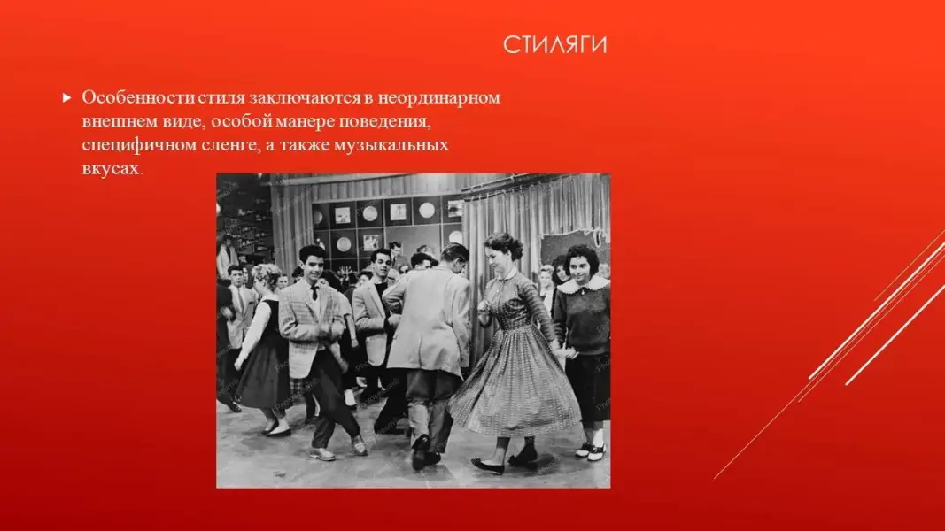 И уже в начале 50-х те, кто относили себя к данной субкультуре, почувствовали на себе постоянное преследование. Таких людей систематически высмеивали и осуждали на комсомольских собраниях. Движение практически угасло в середине 60-х годов (Презентация 2. ppt. 3 слайд).