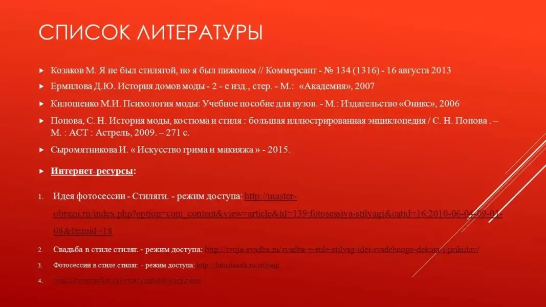- Технические средства обучения (интерактивная доска). Презентации: "Создание образа в стиле 20-х годов XX столетия", "Создание образа в стиле 50 - х годов XX столетия. Стиляги", "Создание образа в стиле 70 - х годов XX столетия. Хиппи", "Создание образа в стиле 80 - х годов XX столетия", "Создание образа в стиле 90-х годов XX столетия. Стиль "Гранж".", фрагменты кинофильмов, аудиозаписи.