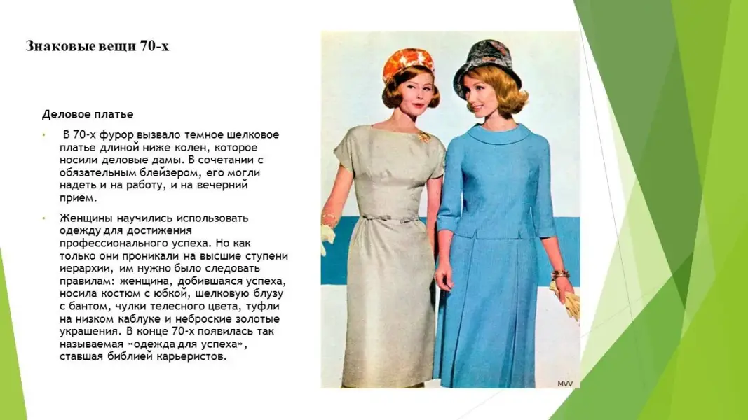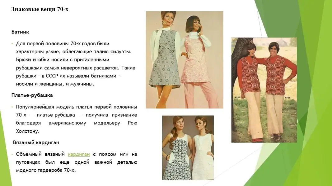 Это десятилетие сочетало множество стилевых направлений: этно, классика, романтика, фольклор, хиппи, спорт, милитари, сафари, диско, унисекс, панк. (Приложение 2), (Презентация 3. ppt. 3,4 слайды).