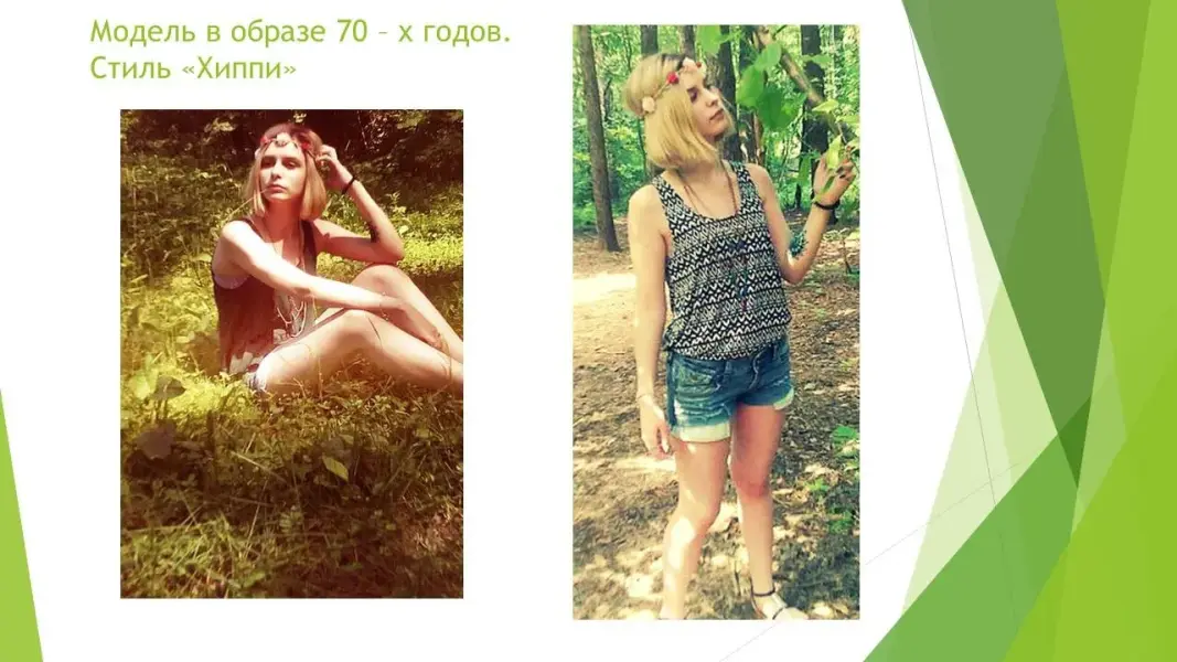 Знаковые вещи 70-х годов (Презентация 3. ppt. 5, 6, 7, 8 слайды). Тенденции десятилетия (Презентация 3. ppt. 9 слайд). Особенности стиля "хиппи". История возникновения. Общие признаки стиля (Презентация 3. ppt. 10, 11, 12 слайды) Прически. Макияж (Приложение 2), (Презентация 3. ppt. 13, 14 слайды).
