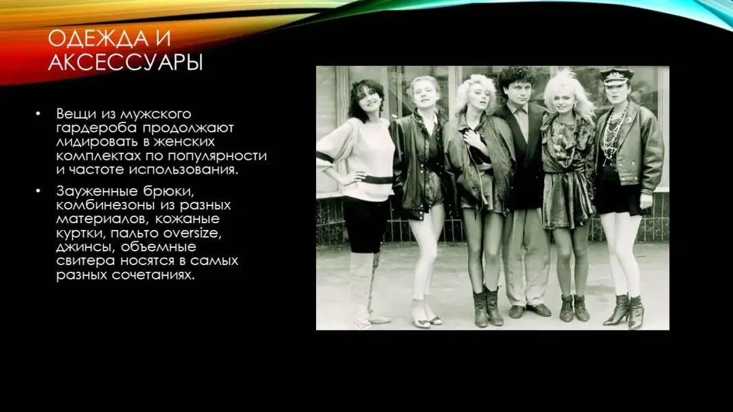 Молодежь, которая является поклонниками рок - музыки и продолжателями этих традиций создают образы, сочетающие кожаные куртки с кроссовками и шляпами, спортивные бейсболки с обувью на каблуке. А те, кто любит поп-музыку того десятилетия, предпочитают наряды в стиле диско, яркие, сверкающие и немного космические. (Презентация 4. ppt. 4 слайд).