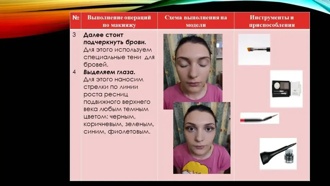 Диагностика модели (Презентация 4. ppt. 19 слайд). Инструкционно-технологическая карта образного макияжа в стиле 80-х годов. (Презентация 3. ppt. 20, 21, 22 слайды). Модель в образе 80 - х годов. (Презентация 4. ppt. 23, 24 слайды).