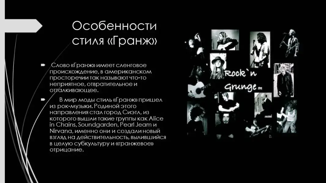 В мир моды стиль "Гранж" пришел из рок-музыки. Родиной этого направления стал город Сиэтл, из которого вышли такие группы как Alice in Chains, Soundgarden, Pearl Jeam и Nirvana, именно они и создали новый взгляд на действительность, вылившийся в целую субкультуру и "гранжевое" отрицание. (Презентация 5. ppt. 3 слайд). (Приложение 3).