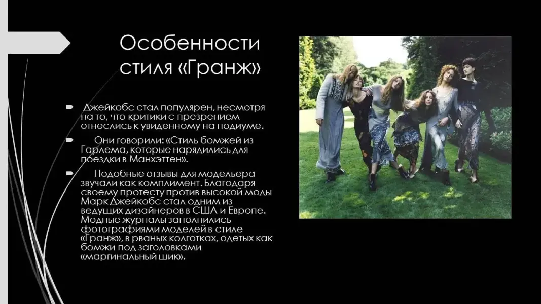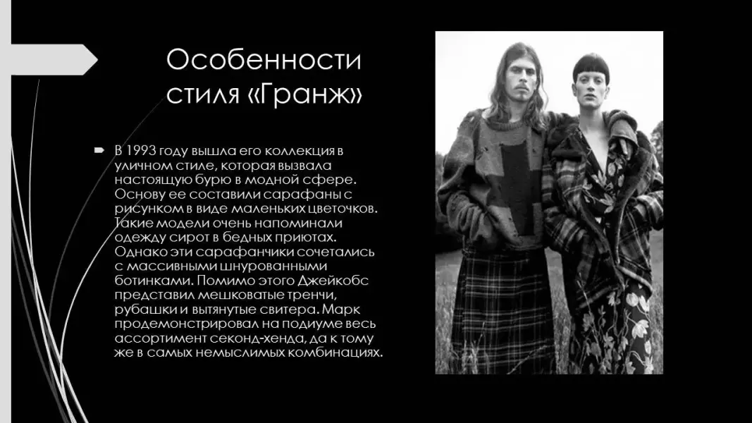 В Высокую моду "Гранж" пришел в начале 90-х благодаря творчеству американского модельера Марка Джейкобса. (Презентация 5. ppt. 5, 6, 7, 8, 9, 10 слайды). (Приложение 3).