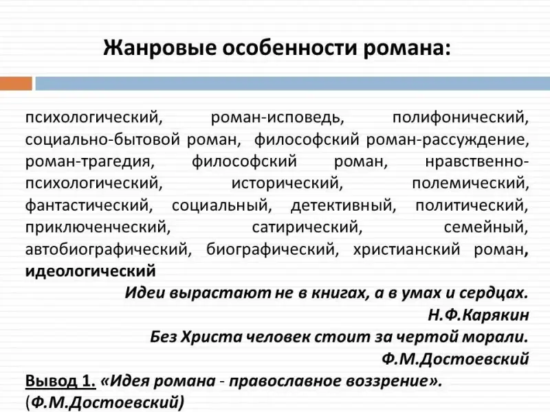 - Сначала попробуйте определить жанровую особенность романа. (Беседа. Примерные ответы: психологический, религиозный) Да, роман неоднозначен. (Слайд 6) Ф.М.Достоевский считал его психологическим, романом-исповедью. М.М.Бахтин - полифоническим. Другие исследователи видели в нем: социально-бытовой роман, философский роман-рассуждение, роман-трагедию, просто философский роман, нравственно-психологический, исторический, полемический, фантастический, социальный, детективный, политический, приключенческий, сатирический, семейный, автобиографический, биографический, христианский роман. А Н.Н.Страхов отнес роман к идеологическому. Последняя версия видится более вероятной: Достоевский исследует родовую черту русских людей, отмеченную критиком, - "чрезвычайную серьезность, как бы религиозность, с которою они предаются своим идеям".