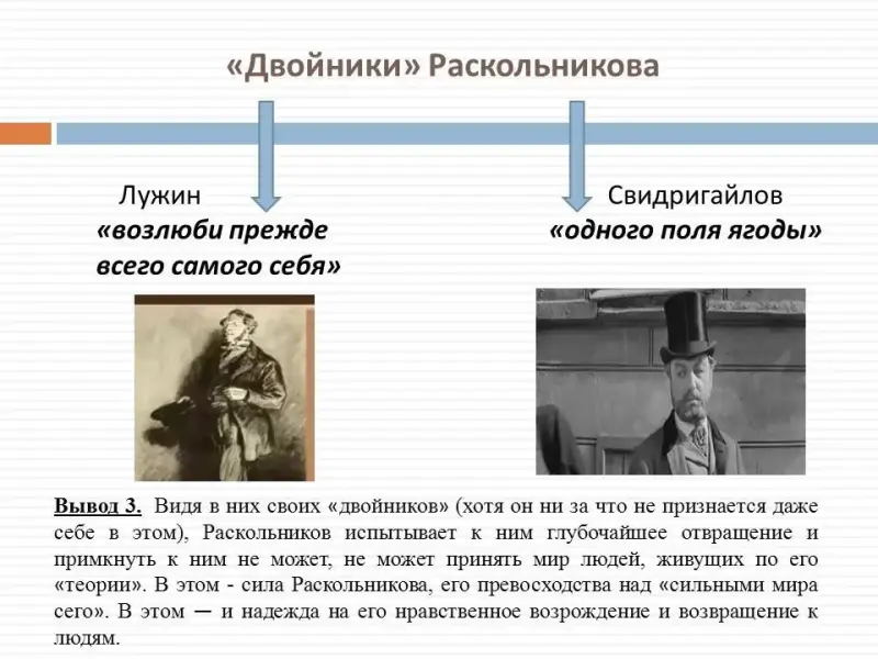- Назовите "двойников" Раскольникова. Какие преступления они совершили, и какие получили наказания? (Беседа. Слайд 9) Действительно, Петр Петрович Лужин живет по принципу "возлюби прежде всего самого себя". Этот принцип позволяет ему, не задумываясь, унизить, погубить человека, растоптать чужую жизнь. Аркадий Свидригайлов же - натура гораздо более сложная. Это не полный эгоист, как Лужин, не просто злодей и преступник. Они (он и Раскольников) "одного поля ягоды". Он погибает.