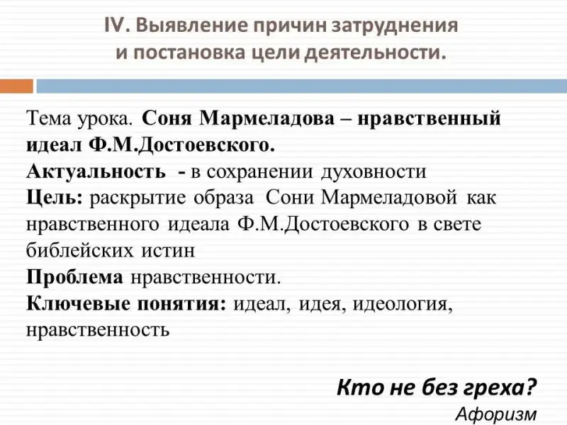 - Какие цели и задачи надо выполнить? (Проговаривают. Примерные ответы. "Раскрыть образ Сони в романе", "Показать духовную эволюцию Сони", "Сравнить идею Сони с идеей Раскольникова". Слайд 8) Но, пожалуй, самая главная задача нашего урока - не судить героев (они сами себя наказывают!), а понять их, понять причины их падения. Понять, принять и простить, ибо "кто не без греха"? (Записать эпиграф) Актуальность выбранной темы очевидна: она обусловлена современными условиями жизни, когда обращение к духовности стало приоритетным в российском образовании, а в области литературы в особенности. (Создание ситуации интереса)