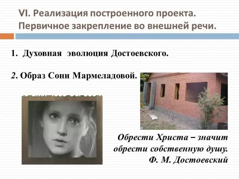Вывод 12. Создав образ Сони Мармеладовой, Достоевский создал антипод Раскольникову и его теории (добро, сострадание, противостоящие злу). Жизненная позиция Сони отражает взгляды самого писателя, его веру в любовь, справедливость и всепрощение.