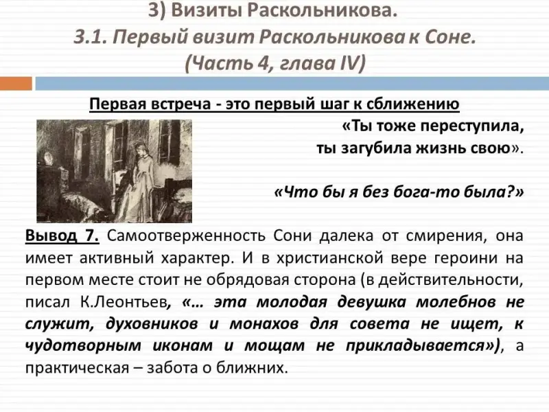 - Как ведет себя Соня? (Примерный ответ. Она была ошеломлена, плохо верила в то, о чем говорил Раскольников, но молча делала все.) Соня как истинный друг собирается идти вместе в Раскольниковым. Она стремится быть с ним рядом до конца. Но Раскольников останавливает ее и уходит один.