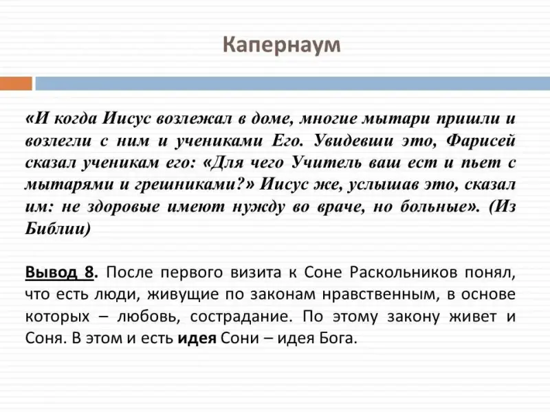Вывод 8. После первого визита к Соне Раскольников понял, что есть люди, живущие по законам нравственным, в основе которых - любовь, сострадание. По этому закону живет и Соня. В этом и есть идея Сони - идея Бога.
