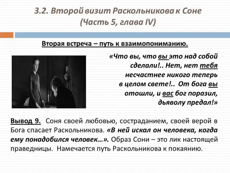 Вывод 9. Слезы - это новая ступень в жизни героя. В этом - заслуга Сони: она своей любовью, состраданием, своей верой в Бога спасает Раскольникова. "В ней искал он человека, когда ему понадобился человек...". Образ Сони - это лик настоящей праведницы. Вы, безусловно, обратили внимание на то, что эти два эпизода представляют собой кольцевую композицию. А сравнение двух "правд" героев показывает их контраст. Однако уже намечается путь Раскольникова к покаянию.
