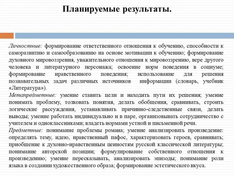 - Предметные: понимание проблемы романа; умение анализировать произведение: определять тему, идею, нравственный пафос, характеризовать героев, сравнивать; приобщение к духовно-нравственным ценностям русской классической литературы; понимание авторской позиции; формулирование собственного отношения к произведению; умение пересказывать, анализировать эпизоды; понимание роли языка в создании художественного образа; формирование эстетического вкуса.