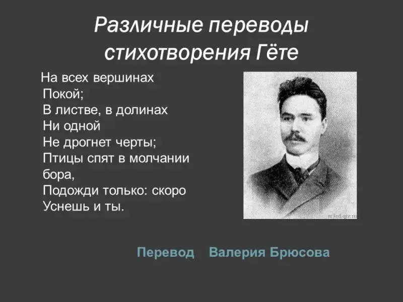 - Деятельность переводчиков прозы и поэзии является большим вкладом в распространение литературных памятников. Давайте познакомимся со стихотворением немецкого поэта XIX века Иоганна Вольфганга фон Гёте.