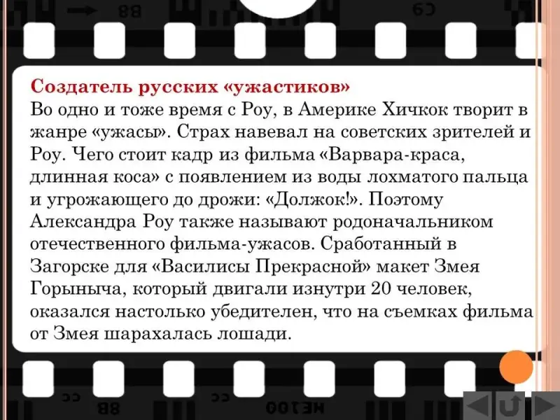 На уроках эстетики мы знакомим учащихся с творчеством самых замечательных режиссеров, для которых сказка стала делом всей их жизни: А.Роу, А.Птушко, Н.Кошеверовой и М.Шапиро; сценаристов киносказок: Е.Шварца, С.Михалкова, О.Леонидова, Г.Владычиной; с творчеством киноактеров, глубоко понимающих и любящих жанр киносказки: Г.Милляра, Л.Потемкина, С.Столярова, А.Хвыля, Э.Гарина и других.