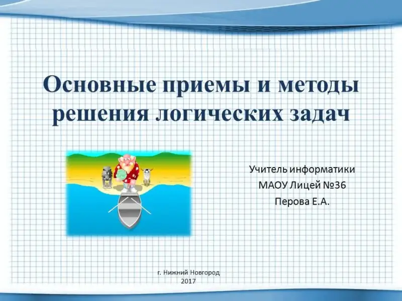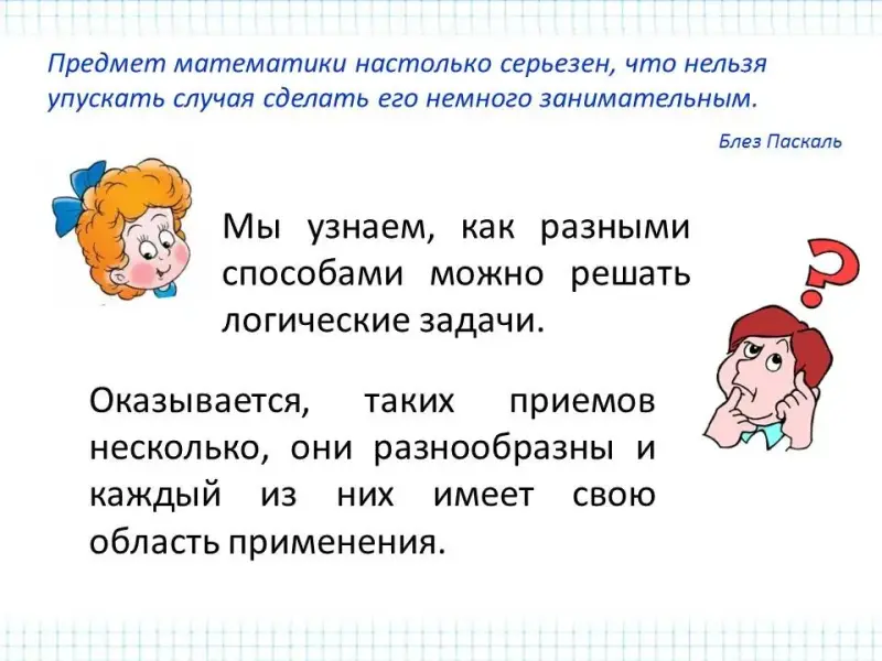 Учитель: Предмет математики настолько серьезен, что нельзя упускать случая сделать его немного занимательным. (Блез Паскаль). Сегодня на уроке мы узнаем, как разными способами можно решать логические задачи. Оказывается, таких приемов несколько, они разнообразны и каждый из них имеет свою область применения. (Слайд 3)