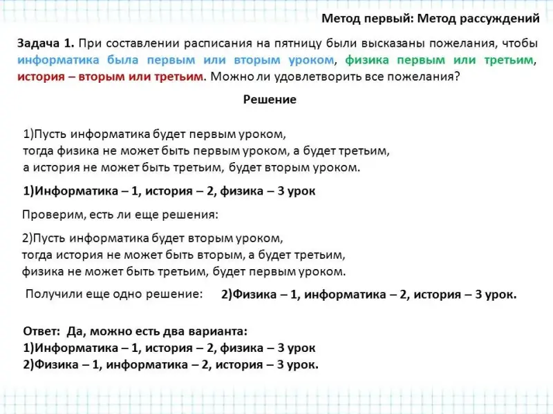 На экране появляется задача: При составлении расписания на пятницу были высказаны пожелания, чтобы информатика была первым или вторым уроком, физика первым или третьим, история - вторым или третьим. Можно ли удовлетворить все пожелания?