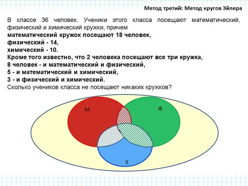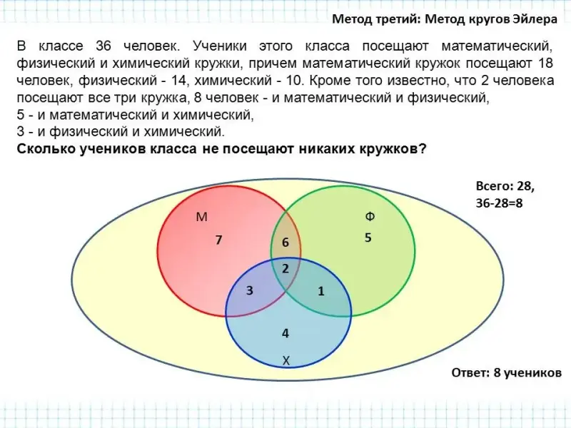 Учитель: Следующий метод решения логических задач тоже вам хорошо знаком: Метод кругов Эйлера. Задача: В классе 36 человек. Ученики этого класса посещают математические, физический и химический кружки, причем математический кружок посещают 18 человек, физический - 14, химический - 10. Кроме того известно, что 2 человека посещают все три кружка, 8 человек - и математический и физический, 5 - и математический и химический, 3 - и физический и химический. Сколько учеников класса не посещают никаких кружков?