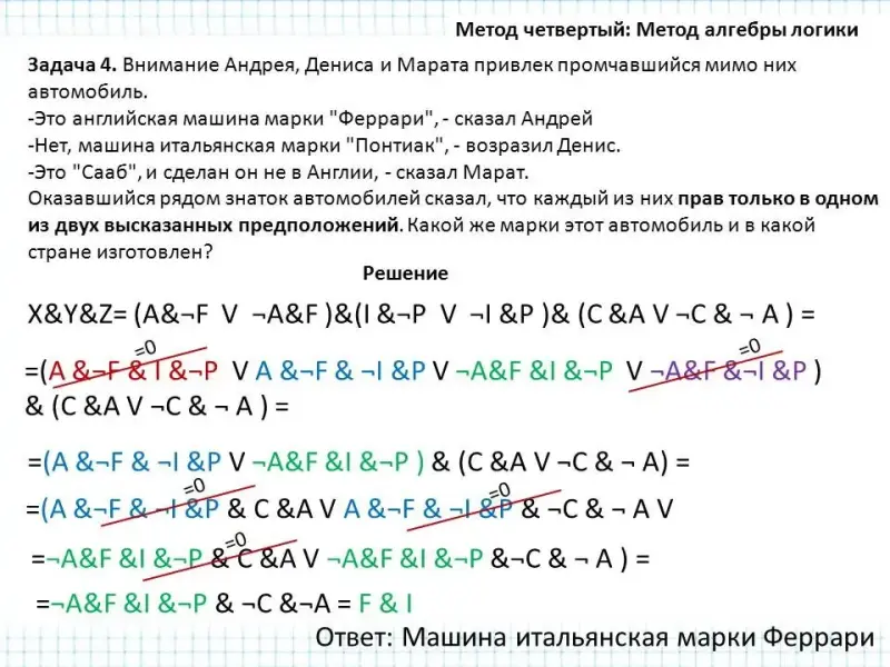 Учитель: Давайте теперь познакомимся с методом алгебры логики для решения следующей задачи: Внимание Андрея, Дениса и Марата привлек промчавшийся мимо них автомобиль.