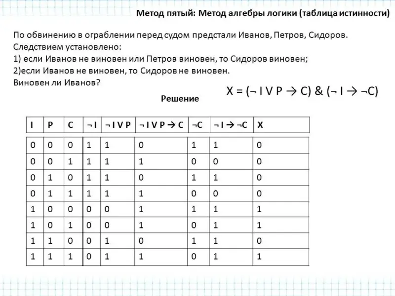 Учитель: Можно не выполнять сложные преобразования, а составить таблицу истинности для высказывания и по ней определить ответ задачи. Рассмотрим этот метод при решении следующей задачи: По обвинению в ограблении перед судом предстали Иванов, Петров, Сидоров. Следствием установлено: