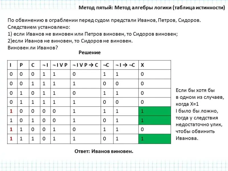 Учитель: А теперь давайте ответим на вопрос задачи. Виновен ли Иванов?