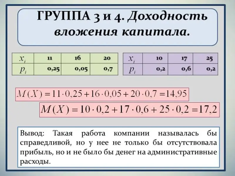 Тема учебного раздела: Математическое ожидание и его применение в экономике (расчет прибыли кампании, оценка среднего значения доходности вложения капитала).