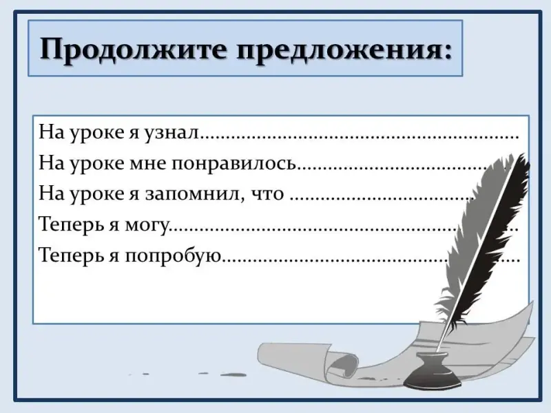 В конце урока учащимся предлагается продолжить предложения (Слайд №18).