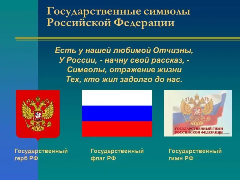 Что такое государственные символы? Каждое государство имеет свои отличительные символы. Это то, что обычно вспоминают люди, когда говорят или думают об этом государстве. Символом может быть сочетание цветов на флаге, какое-то изображение на гербе, слова и мелодия государственного гимна. Государственные символы имеют особое значение для всех граждан одной страны. Государственные символы представляют страну за границей: например, при победе российских спортсменов поднимают российский флаг и звучит российский гимн. Посольство страны за границей украшено ее флагом и гербом.