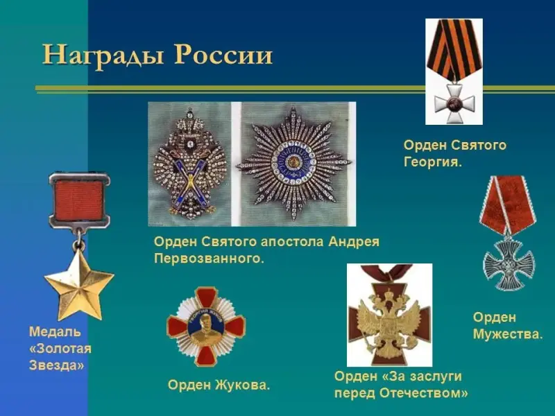 Государство награждает особо отличившихся граждан орденами и медалями. Орден дается человеку персонально за его заслуги, а медаль вручается каждому, кто участвовал в важном для истории событии, например, в освобождении города во время войны (медаль "За оборону Ленинграда", "За оборону Севастополя", "За боевые заслуги")
