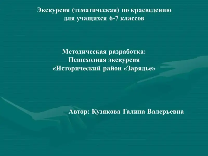 Экскурсионная работа занимает важное место в образовательной работе школы. Основной задачей экскурсионной работы является формирование мировоззрения школьников. Экскурсионная работа выполняет так же ряд других важных задач: патриотическое воспитание, эстетическое воспитание, культурологическое воспитание, формируя нравственные качества и культуру человека. В настоящее время экскурсия - это методически продуманный показ достопримечательных объектов (памятники культуры, музеи, предприятия, местность и др.). Представленная методическая разработка дает возможность учителю самостоятельно, не прибегая к услугам платных гидов, провести экскурсию для учеников и родителей. Это - великолепная возможность не только расширить свой кругозор и попробовать себя в ином качестве, но и поднять свой авторитет в глазах детей и их родителей.
