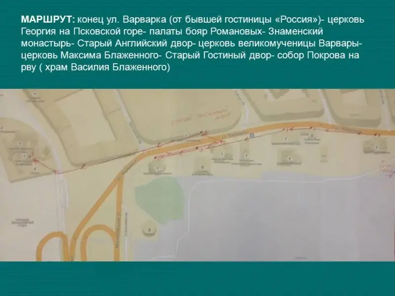 МАРШРУТ: конец ул. Варварка (от бывшей гостиницы "Россия") - церковь Георгия на Псковской горе - палаты бояр Романовых - Знаменский монастырь - Старый Английский двор- церковь великомученицы Варвары - церковь Максима Блаженного - Старый Гостиный двор - собор Покрова на рву (храм Василия Блаженного)