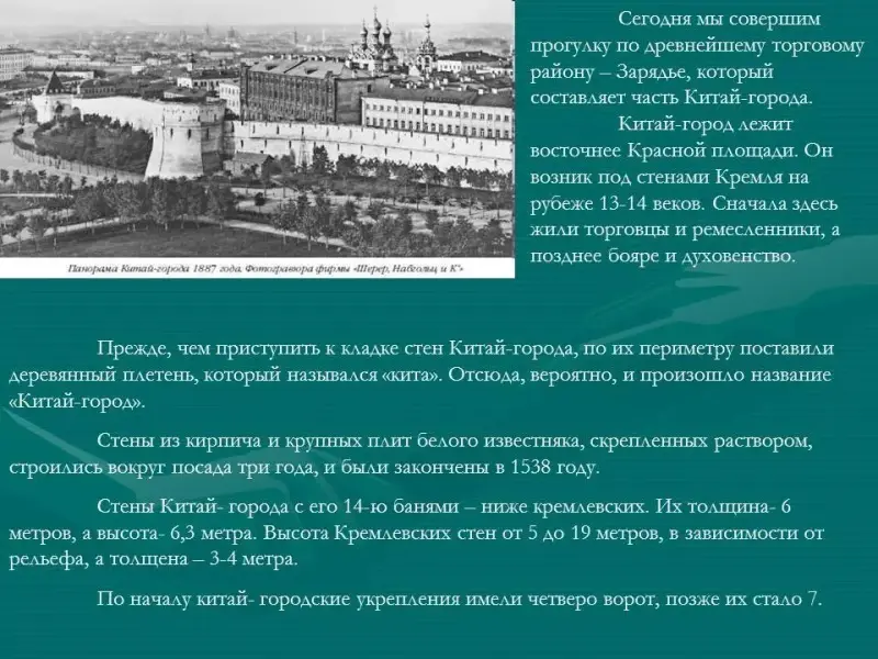 Сегодня мы совершим прогулку по древнейшему торговому району - Зарядье, который составляет часть Китай-города (Приложение 2).