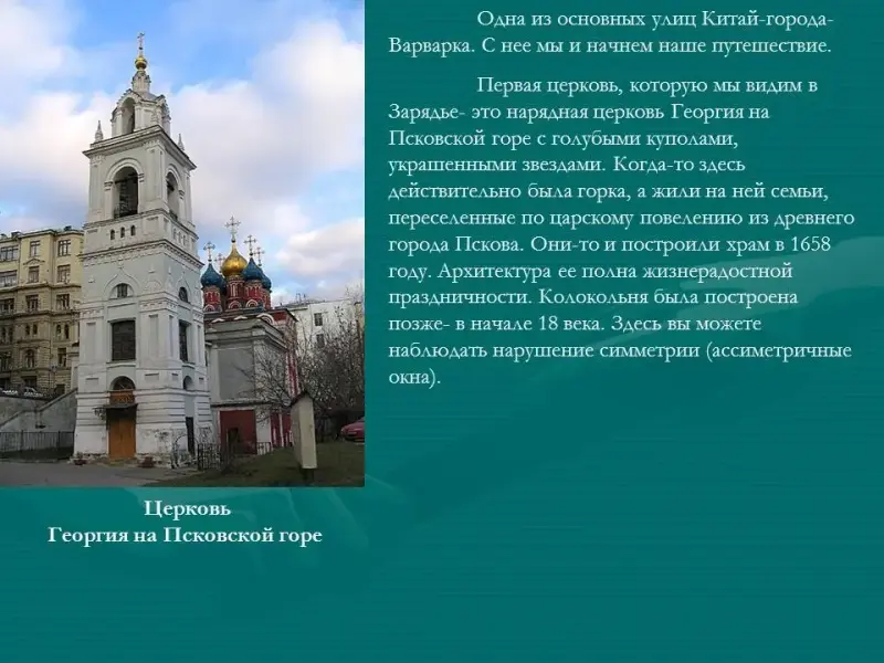 Первая церковь, которую мы видим в Зарядье- это нарядная церковь Георгия на Псковской горе с голубыми куполами, украшенными звездами (Приложение 1, рис.1). Когда-то здесь действительно была горка, а жили на ней семьи, переселенные по царскому повелению из древнего города Пскова. Они-то и построили храм в 1658 году. Архитектура ее полна жизнерадостной праздничности. Колокольня была построена позже- в начале 18 века. Здесь вы можете наблюдать нарушение симметрии (ассиметричные окна).