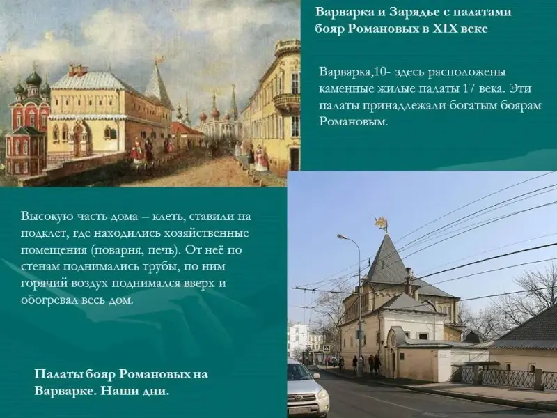 Рядом расположены каменные жилые палаты 17 века (Приложение 1, рис.2). Эти палаты принадлежали богатым боярам Романовым (Варварка, дом № 10).