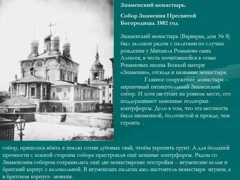 Знаменский монастырь (Варварка, дом № 8) был заложен рядом с палатами по случаю рождения у Михаила Романова сына Алексея, в честь почитавшейся в семье Романовых иконы Божьей матери "Знамение", отсюда и название монастыря (Приложение 1, рис.4).