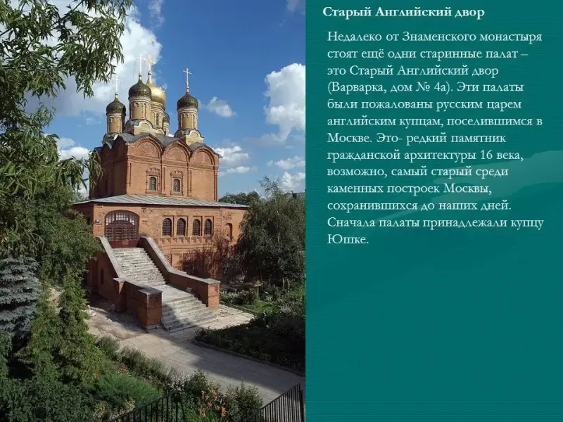 Недалеко от Знаменского монастыря стоят ещё одни старинные палат (Приложение 1, рис.5) - это Старый Английский двор (Варварка, дом № 4а). Эти палаты были пожалованы русским царем английским купцам, поселившимся в Москве. Это - редкий памятник гражданской архитектуры 16 века, возможно, самый старый среди каменных построек Москвы, сохранившихся до наших дней. Сначала палаты принадлежали купцу Юшке (Приложение 1, рис.6).