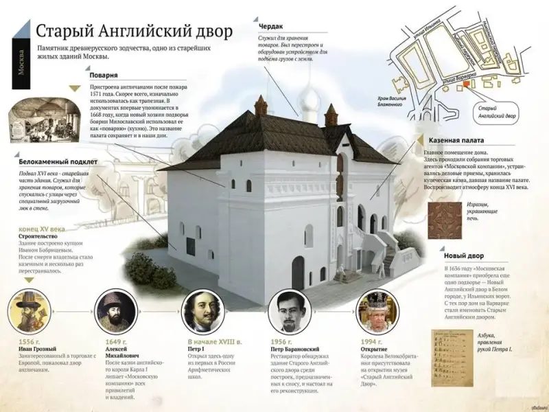 Как же английские купцы попали в Москву? Однажды английская королева снарядила эскадру кораблей для поисков северного морского пути в богатую Индию. Во главе эскадры встал отважный капитан Ричард Ченслер. Но когда корабли оказались в Северном море, начался страшный шторм. Многие корабли погибли в этой буре. И только Ричарду Ченслеру с кучкой матросов удалось добраться до берега. Здесь английские мореплаватели узнали, что находятся на земле, принадлежавшей русскому царю Ивану Грозному. Капитан решил идти прямо в Москву и просить у царя защиты и помощи. Царь Иван принял заморских гостей милостиво и с почестями, и разрешил впредь английским купцам торговать в Москве, а для их нужд пожаловал им эти палаты, поблизости от городского торга.