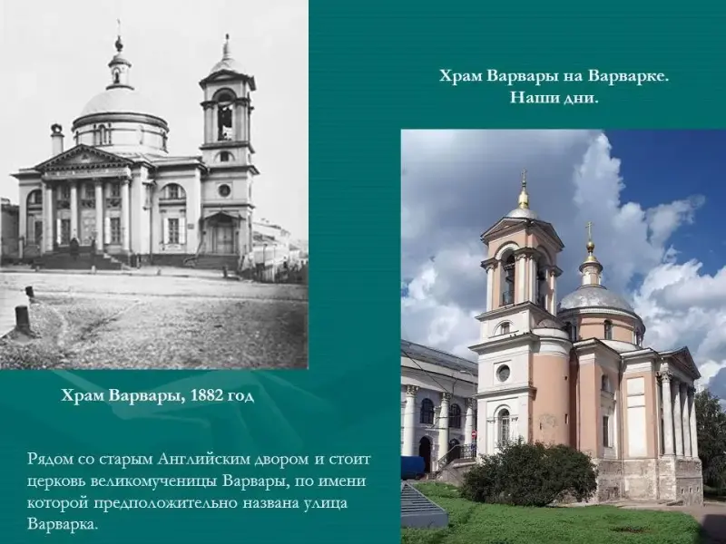 Рядом со старым Английским двором и стоит церковь великомученицы Варвары (Приложение 1, рис.7 и 8), по имени которой предположительно названа улица Варварка.