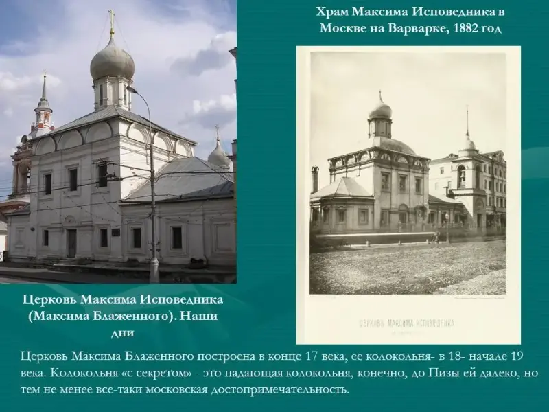 За ней стоит лаконично - строгая церковь Максима Блаженного (Приложение 1, рис.10). Она построена в конце 17 века, ее колокольня в 18 - начале 19 века. Колокольня "с секретом" - это падающая колокольня, конечно, до Пизы ей далеко, но тем не менее все-таки московская достопримечательность (Приложение 1, рис.9).