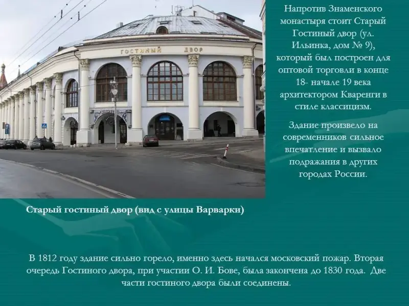 Напротив Знаменского монастыря стоит Старый Гостиный двор (ул. Ильинка, дом № 9), который был построен для оптовой торговли в конце 18- начале 19 века архитектором Кваренги (Приложение 1, рис.11).