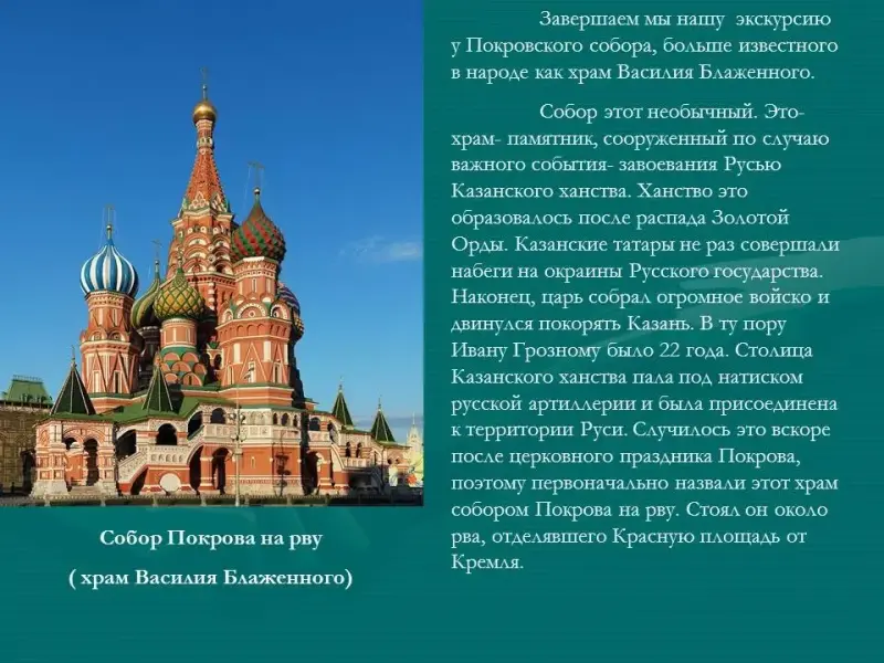 Собор этот необычный. Это- храм- памятник, сооруженный по случаю важного события- завоевания Русью Казанского ханства. Ханство это образовалось после распада Золотой Орды. Казанские татары не раз совершали набеги на окраины Русского государства. Наконец, царь собрал огромное войско и двинулся покорять Казань. В ту пору Ивану Грозному было 22 года. Столица Казанского ханства пала под натиском русской артиллерии и была присоединена к территории Руси. Случилось это вскоре после церковного праздника Покрова, поэтому первоначально назвали этот храм собором Покрова на рву. Стоял он около рва, отделявшего Красную площадь от Кремля.