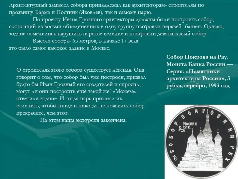 О строителях этого собора существует легенда. Она говорит о том, что собор был уже построен, призвал будто бы Иван Грозный его создателей и спросил, могут ли они построить ещё такой же? "Можем", - ответили зодчие. И тогда царь приказал их ослепить, чтобы нигде и никогда не появился собор прекраснее, чем этот (Приложение 1, рис. 14).