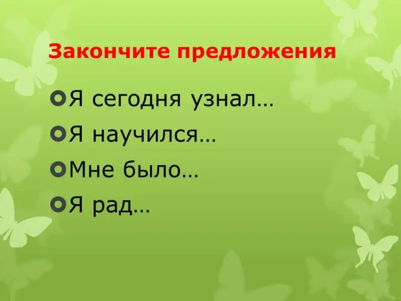 Выберите самую главную тему. - Закончите предложения. Я сегодня узнал... Я научился... Мне было... Я рад... Поставьте себе общую оценку. |