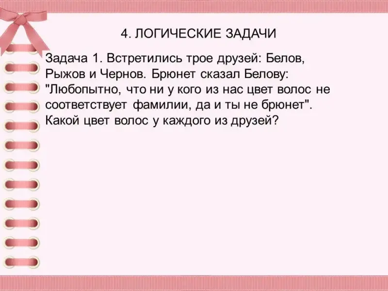 Задача 1. Встретились трое друзей: Белов, Рыжов и Чернов. Брюнет сказал Белову: "Любопытно, что ни у кого из нас цвет волос не соответствует фамилии, да и ты не брюнет".