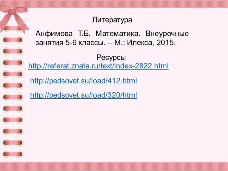 - Анфимова Т.Б. Математика. Внеурочные занятия. 5-6 классы. - М.: Илекса, 2015. - 128 с.: ил.