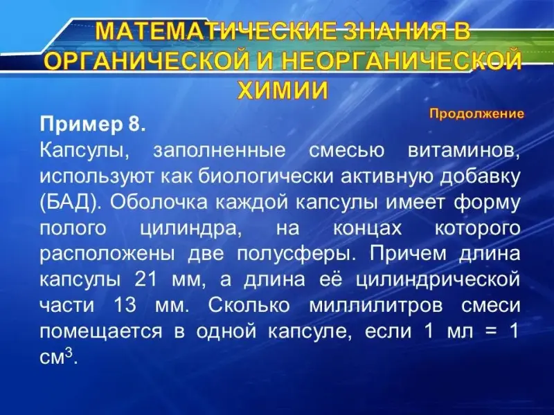 Пример 8. Капсулы, заполненные смесью витаминов, используют как биологически активную добавку (БАД). Оболочка каждой капсулы имеет форму полого цилиндра, на концах которого