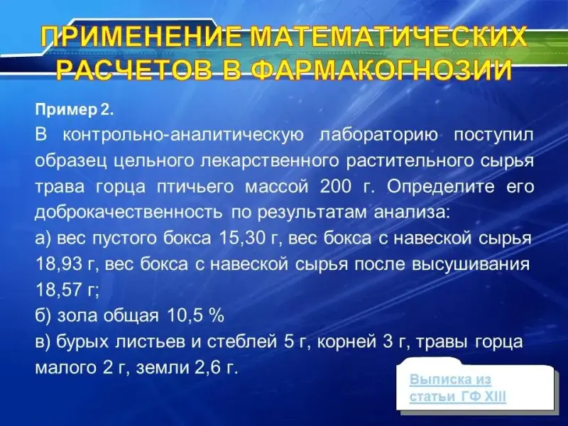 В фармакогнозии проводится анализ доброкачественности сырья. Например, при решении следующей задачи.