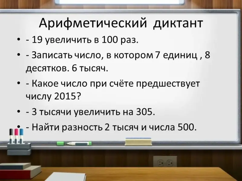 3 Слайд. - Арифметический диктант. Запишите в тетради получившиеся ответы. - 19 увеличить в 100 раз. - Записать число, в котором 7 единиц , 8 десятков. 6 тысяч. - Какое число при счёте предшествует числу 2015? - 3 тысячи увеличить на 305. - Найти разность 2 тысяч и числа 500. |